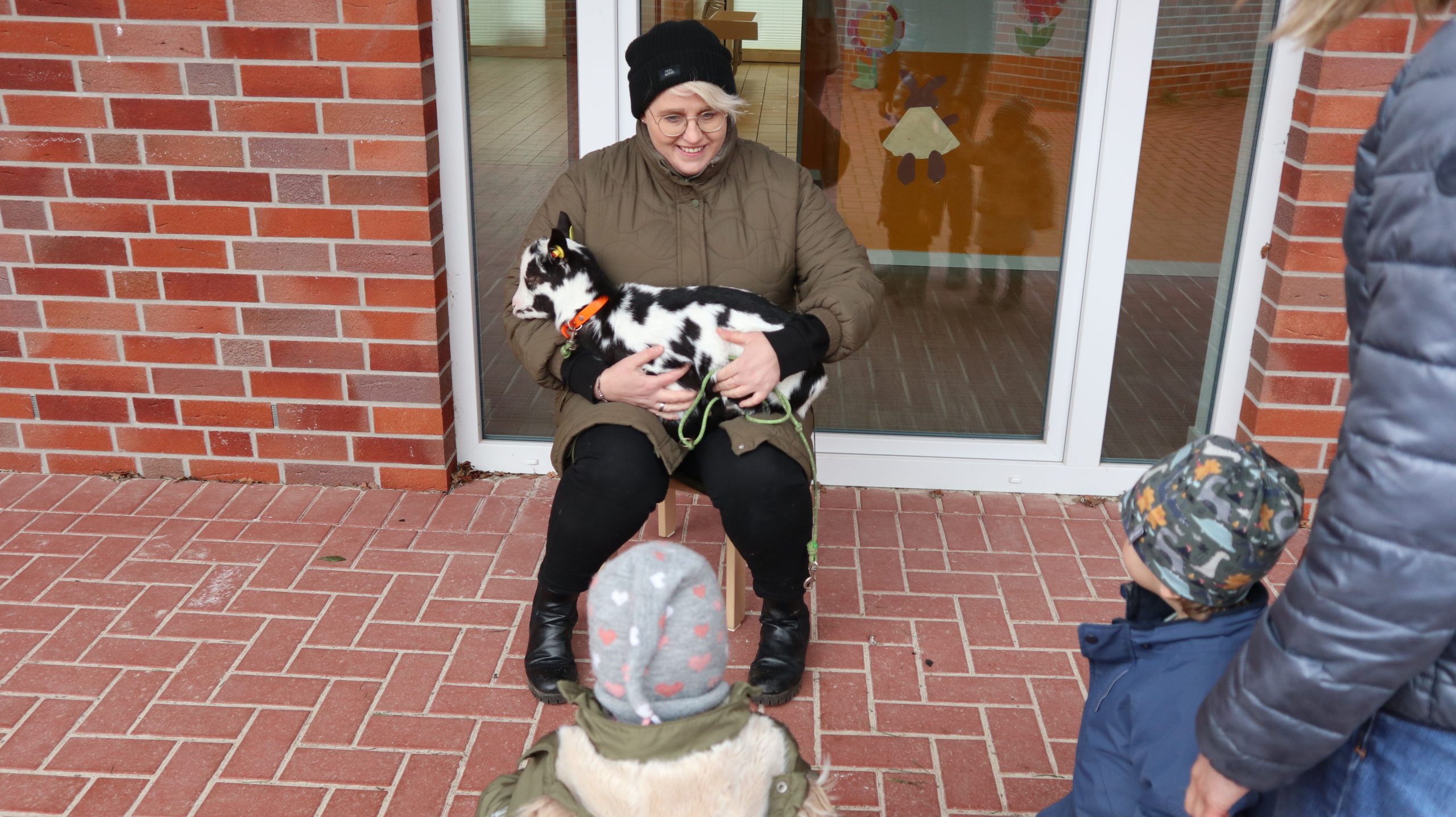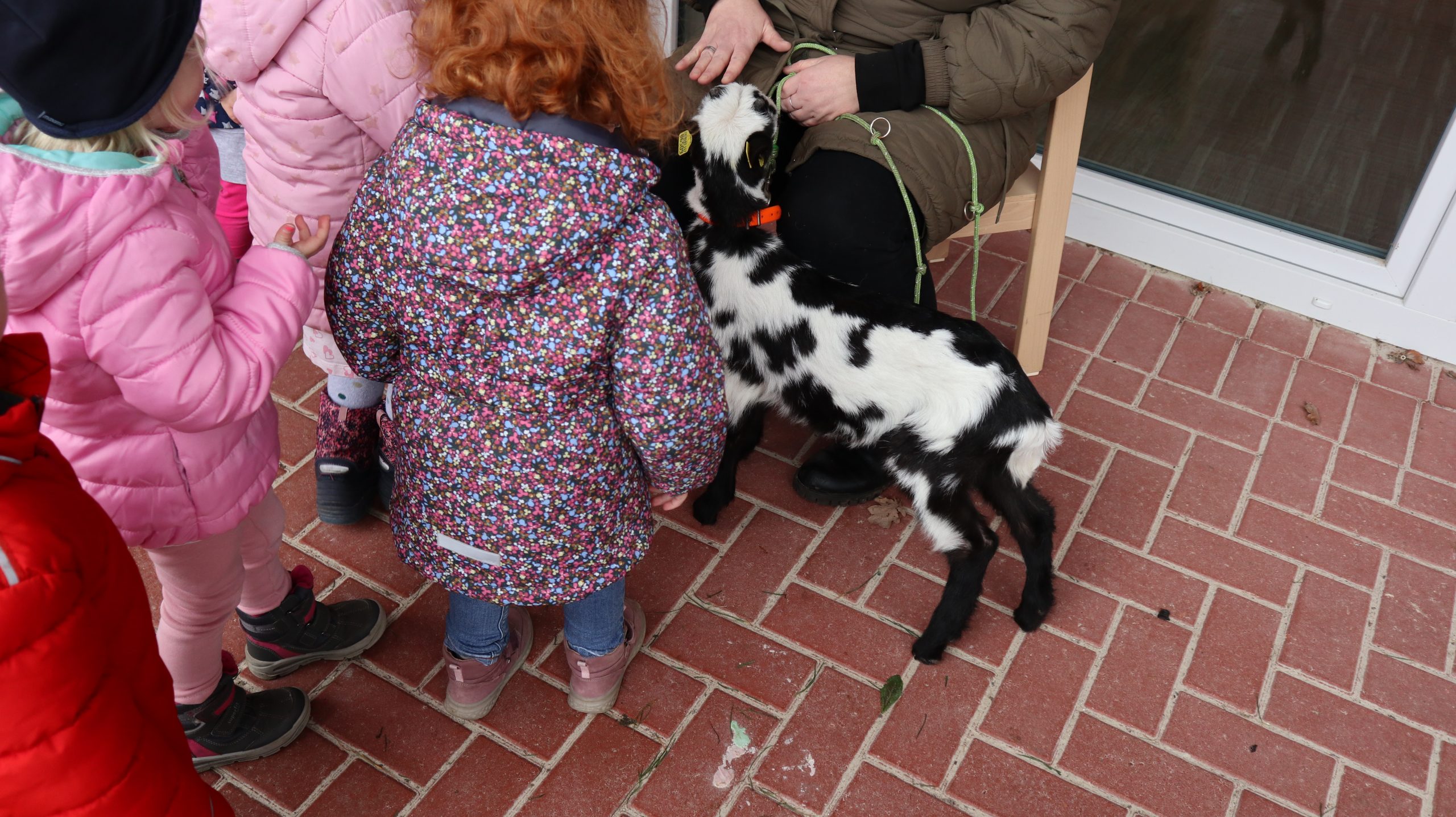 Leider mussten wir, aufgrund des starken Regens, den Besuch auf dem Bauernhof verschieben. Dafür bekamen wir Besuch vom Bauernhof. So hatten die Kinder Gelegenheit sich mit einer Ziege bekannt zu machen.